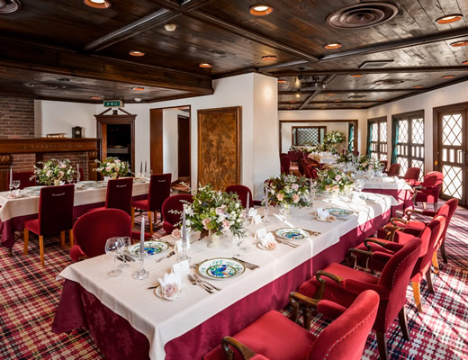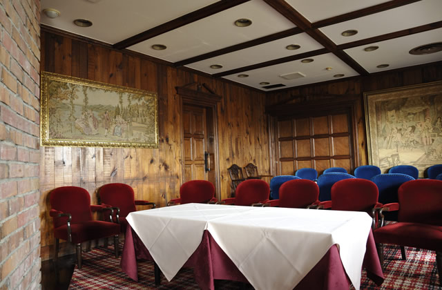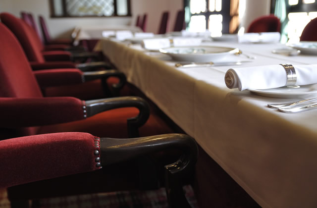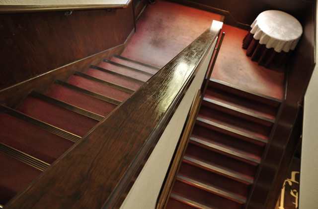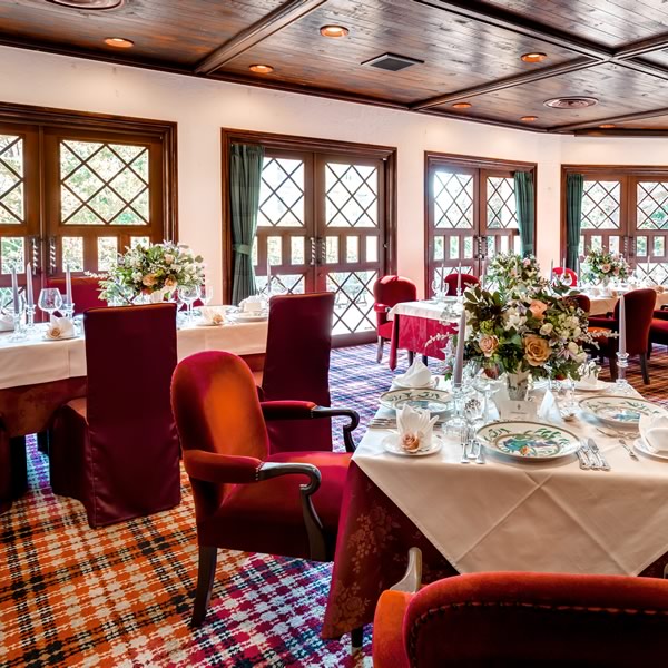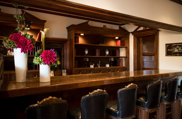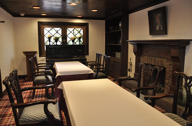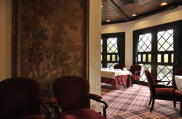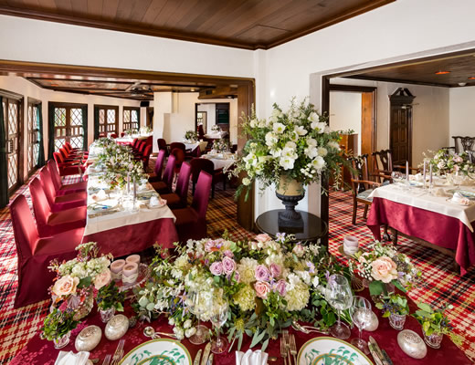 ドイツ人の貿易商クルぺ氏のゲストルームであった部屋を改装した南側に面する1階の大広間。異国情緒漂うタータンチェックのカーペットやレトロな調度品からは、気品ある格式高い会員制クラブであったクルぺ邸だからこその魅力が醸し出されています。あたたかな木目がそのままに残された空間で、当時の華やかな社交場に思いを馳せる上質なパーティータイムを。