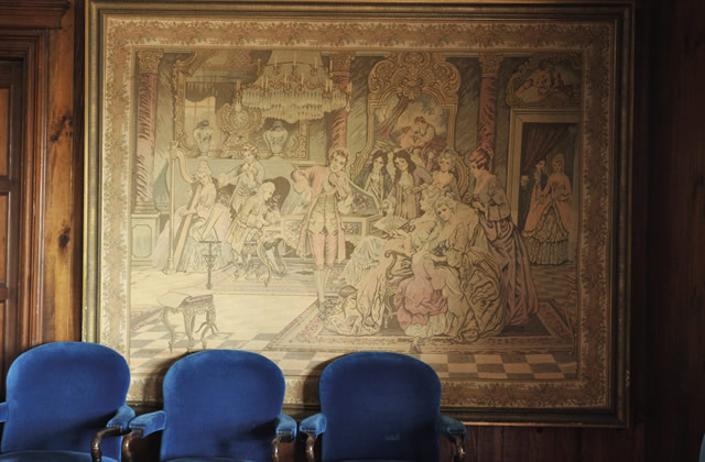 木目を生かした内装やコブラン織りのタペストリーなど、訪れる人々を