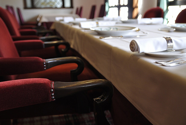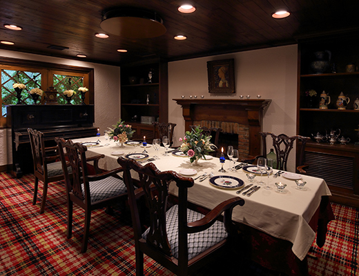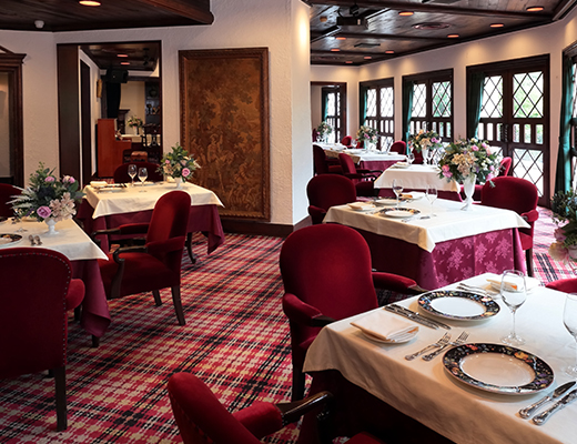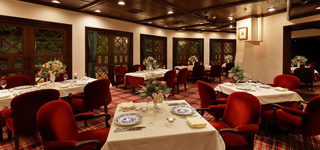 ドイツ人の貿易商の私邸として建てられ、木目調で統一されたインテリアと真紅の絨毯がオーセンティックな趣を演出します。