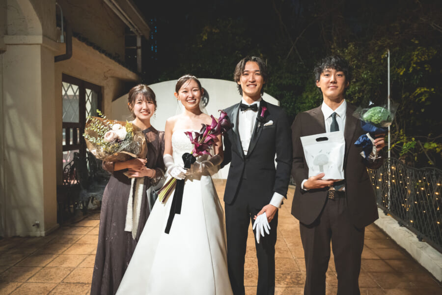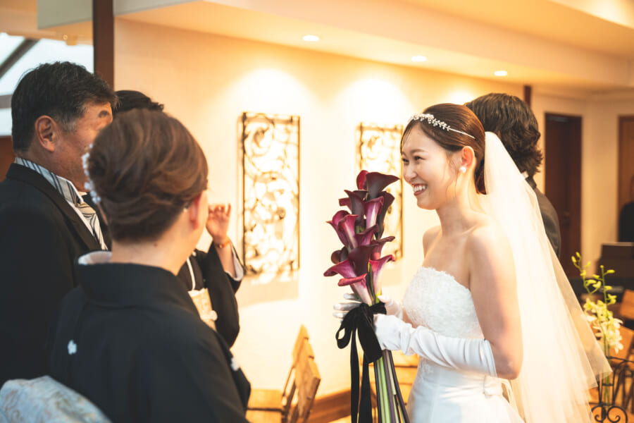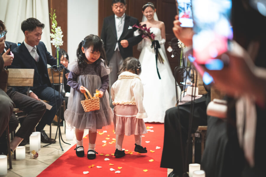 いよいよ迎えられた結婚式当日。挙式の前には大切なご家族とゆったりとした時間を過ごせるファミリーミートを実施されました。初めておふたりの晴れ姿を目にされた親御様には幸せいっぱいの笑顔、そして涙が。ご家族でのお写真も撮られ、和やかなひとときとなりました。挙式が行われたのは、トワイライトのお時間。ロマンチックなイルミネーションの中で、おふたりは愛を誓われました。さらに、フラワーガールとして新郎様、新婦様の姪っ子様達が登場。無邪気に花びらをまくおふたりのお姿に、会場中が笑顔に。たくさんの祝福、笑顔に囲まれ、新郎様新婦様らしいアットホームなお時間を過ごされました。