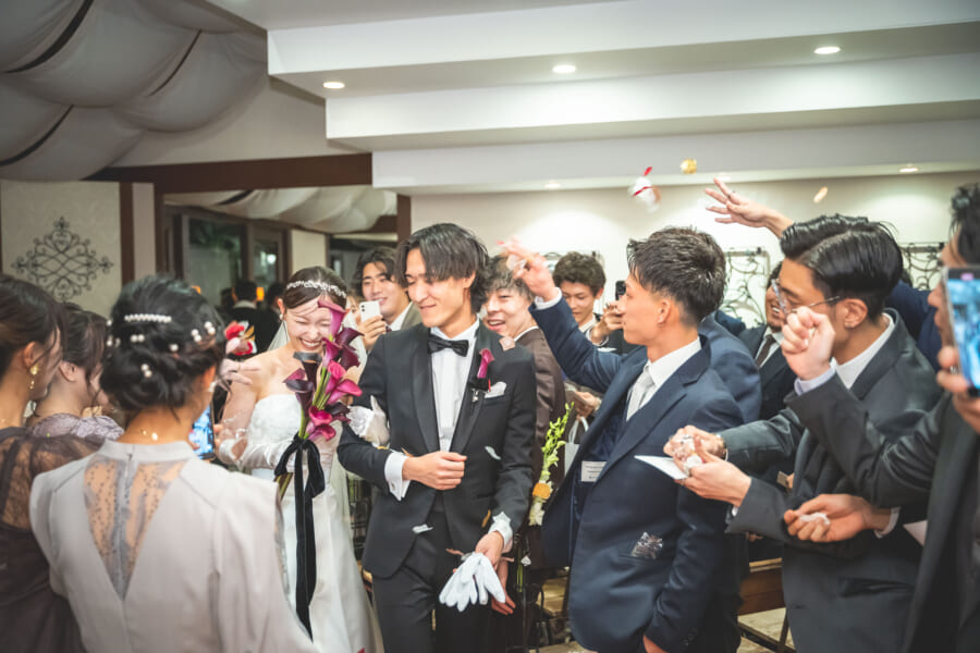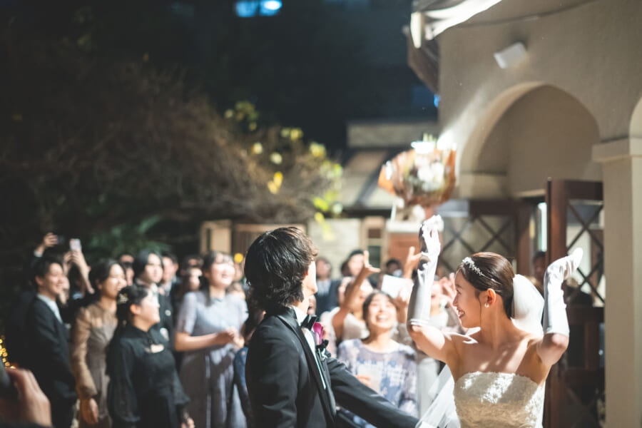 挙式後は、テラスでブーケトス。新婦様が豪快に投げられたブーケを誰がゲットするのだろうと大盛り上がり。これで終わりかと思いきや、新郎様がブロッコリーをお持ちに。男性ゲストにも楽しんでいただけるようにとブロッコリートスを実施されました。見事キャッチされた方には、ブロッコリーとドレッシングをプレゼント。おふたりらしいユニークな演出で、笑顔あふれるお時間となりました。