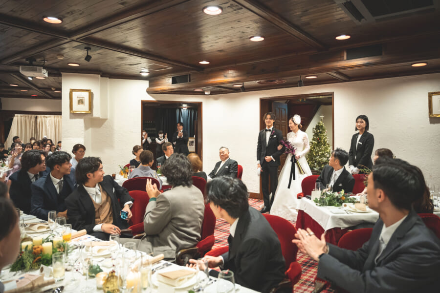 新郎様新婦様こだわりの会場コーディネートのテーマは、大人のクリスマス。落ち着いた色味の赤色のお花に、グリーンをきかせることで、ワンランク上の空間に。キャンドルも取り入れたクリスマスの夜らしい幻想的な雰囲気に、ゲストの方々も感動されていました。そして、たくさんの拍手に包まれながら、新郎様新婦様が入場。ゲストの皆様と一緒に楽しむ特別なクリスマスパーティーがスタートしました。