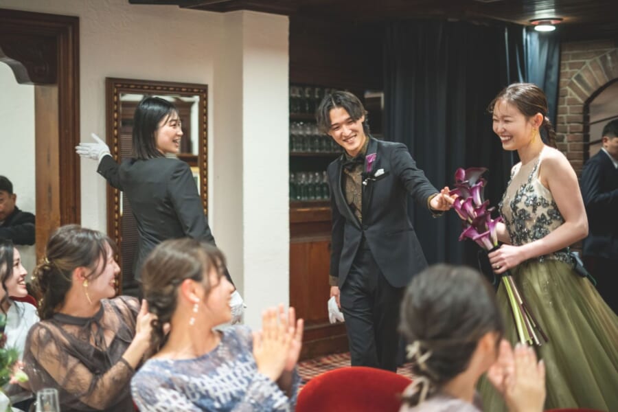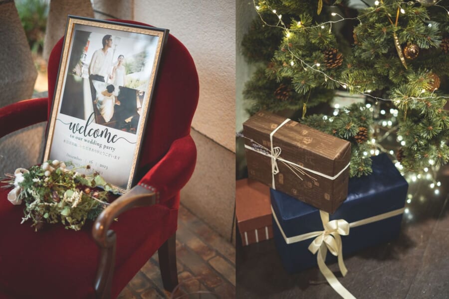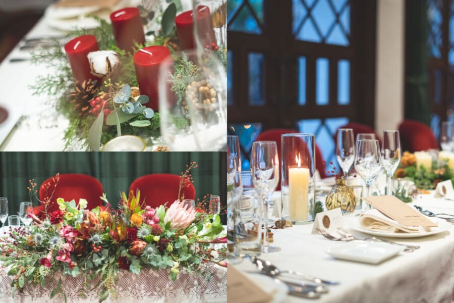 ゲスト想いなおふたりは、ゲストと一緒に楽しめるパーティをご希望。12月ということもあり、クリスマスパーティーのような誰もがワクワクする結婚式になるようにとお打ち合わせを進めてまいりました。「自分たちだからこその結婚式にしたい」とオーダーの会場装花やユニークな演出を取り入れたおふたり。おふたりで一緒に前に進む雰囲気がとても素敵でした。