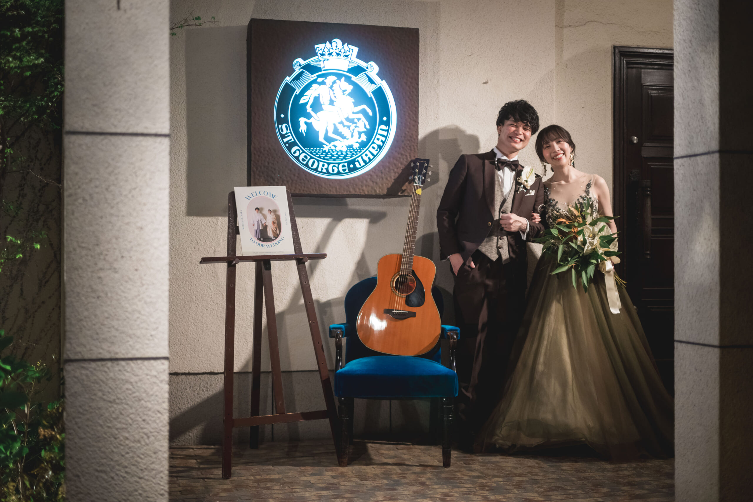 再入場の際には、お色直しのドレスのお色を当てるクイズがペンライトを使って行われ、会場はわくわくした一体感に包まれました。モスグリーンの洗練されたドレスに身を包んだ新婦様に、会場からは歓声が。そして、この日のハイライトとも言えるのが、おふたりによる、それぞれのご友人とのバンド演奏!新郎様はキーボードを、そして新婦様はベースを担当。2グルーブのバンド演奏に、学生時代に戻ったかのような、歓声が送られました。まるでライブ会場のような熱気に包まれ、おふたりとゲストが一体となって大盛り上がり!色とりどりのペンライトが光る、最高のアンコールとなりました。