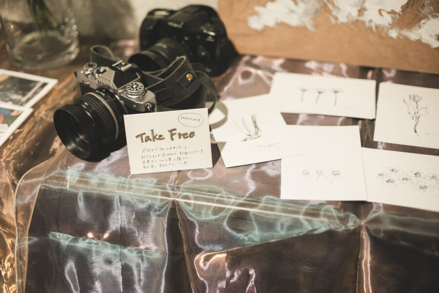 絵を描くことが大好きな新婦様。なんと、自由にお持ち帰りいただけるポストカードをご用意されました。新婦様がひとつひとつ丁寧に描き上げられたポストカード。