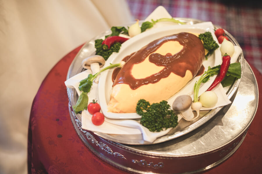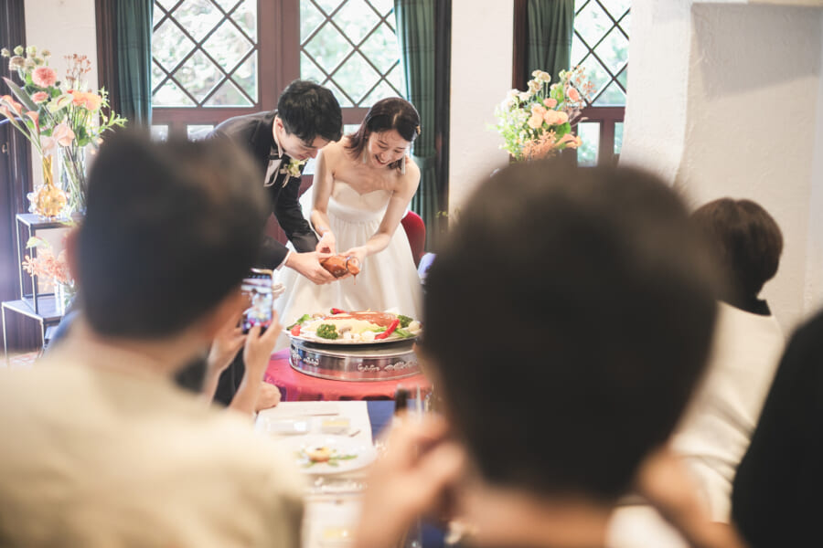 ケーキ入刀ではなく、好きなものを取り入れることで、ゲストの方との会話のきっかけにもなり、より距離が近くお過ごしいただけるのではないかとご提案させていただきました。おふたりの大好きなオムライスにソースをドリップ!大きなオムライスにデミグラスソースをかけるという、見たことのない演出にゲストの方々も驚いておられました。