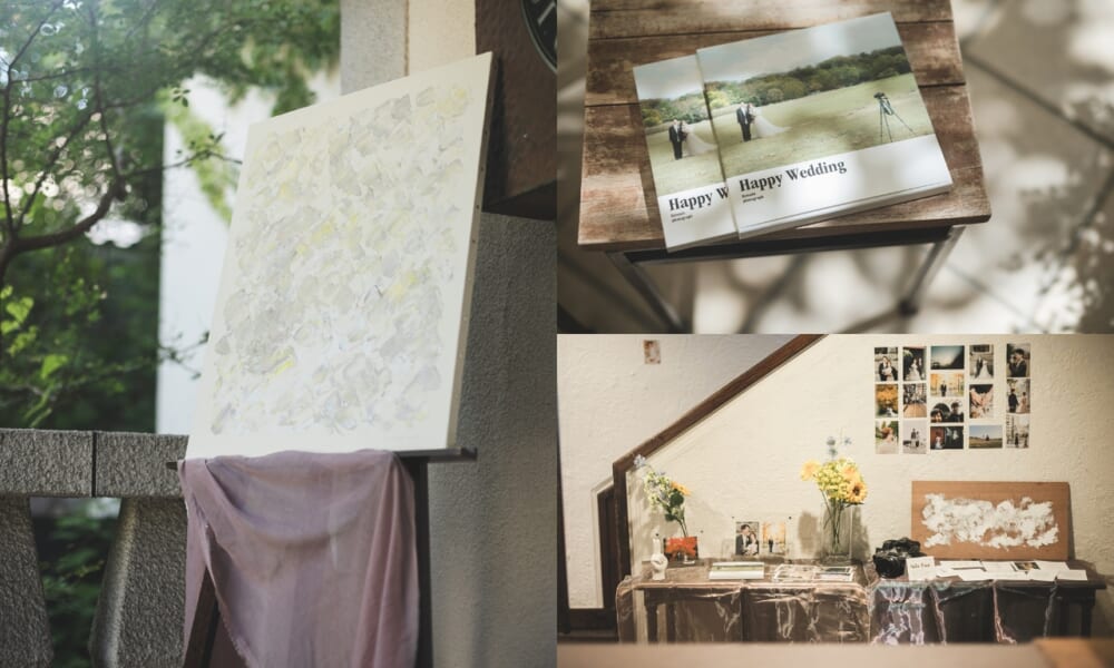そして、新郎様がこだわられたウェルカムスペースにはおふたりの写真や、ウェルカムアイテム。入口にはご友人様が作ってくださったおしゃれなペイントボードも飾られ、会場のBGMは生演奏。