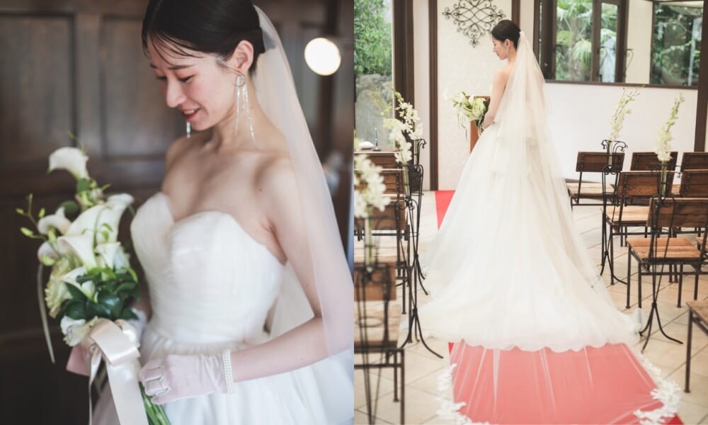 後ろ姿も美しい、ロングベールを纏われた新婦様。セレモニースペースの赤い絨毯が新婦様をより引き立て、誓いの瞬間に相応しい美しい挙式シーンとなりました。
