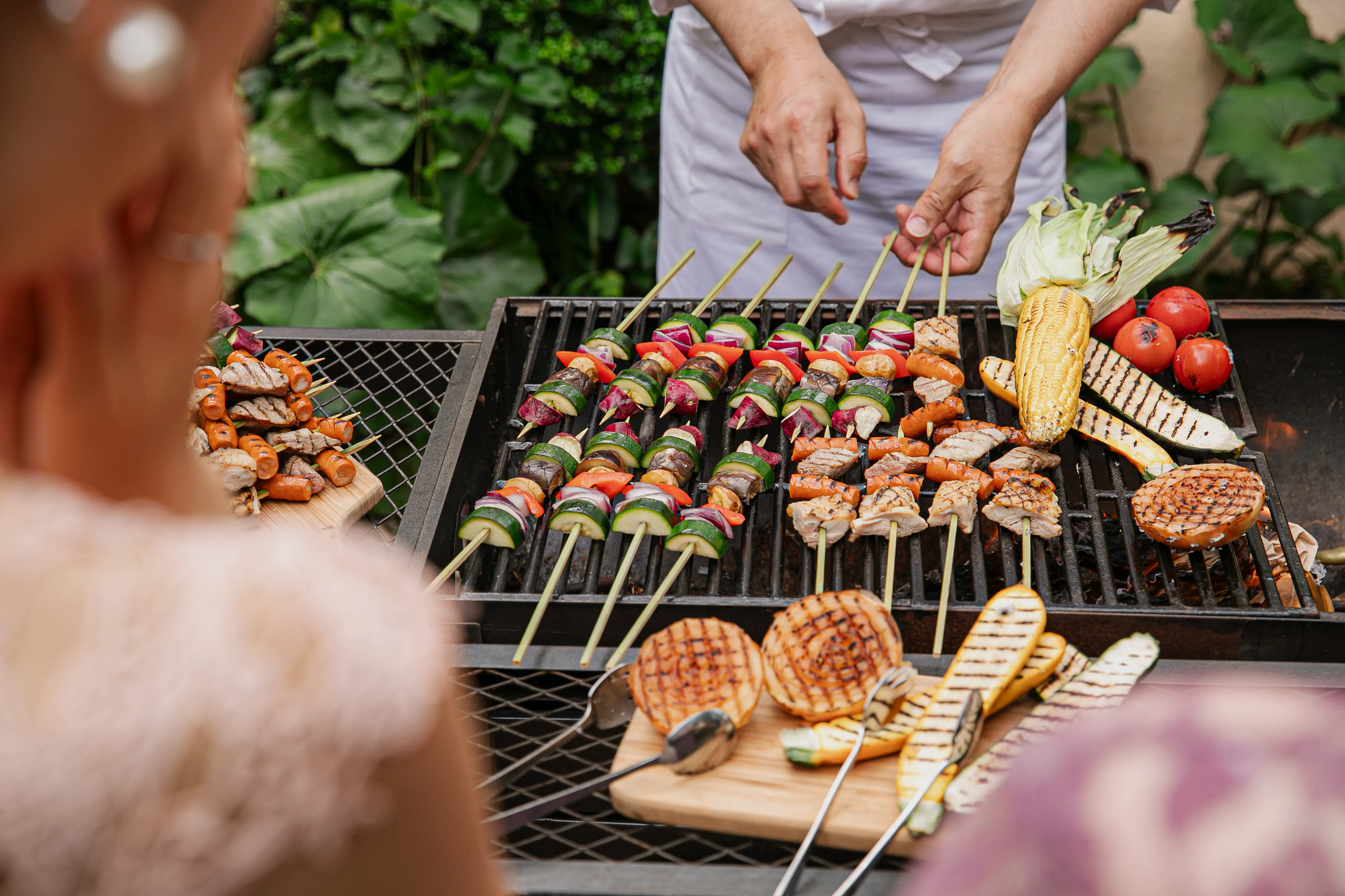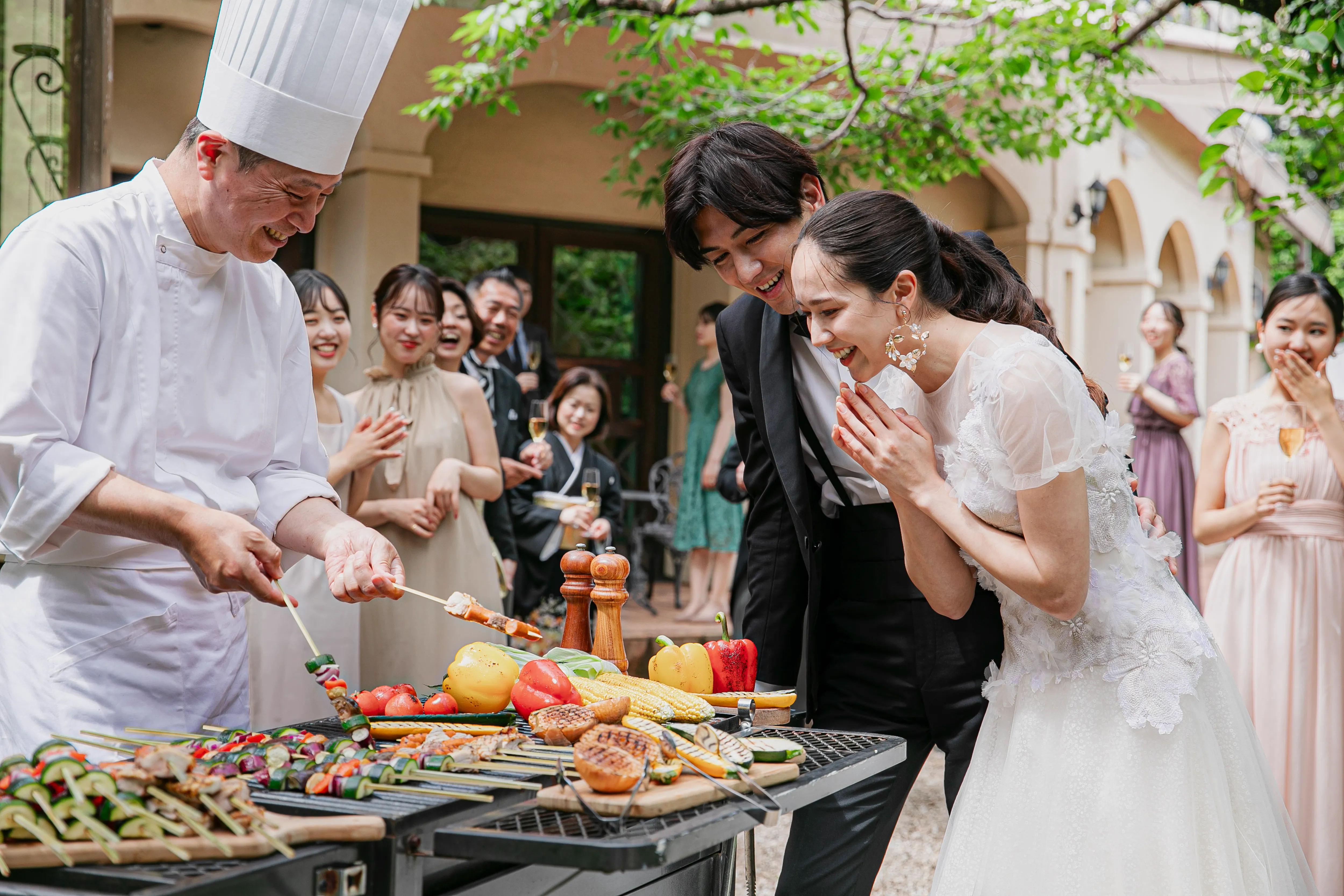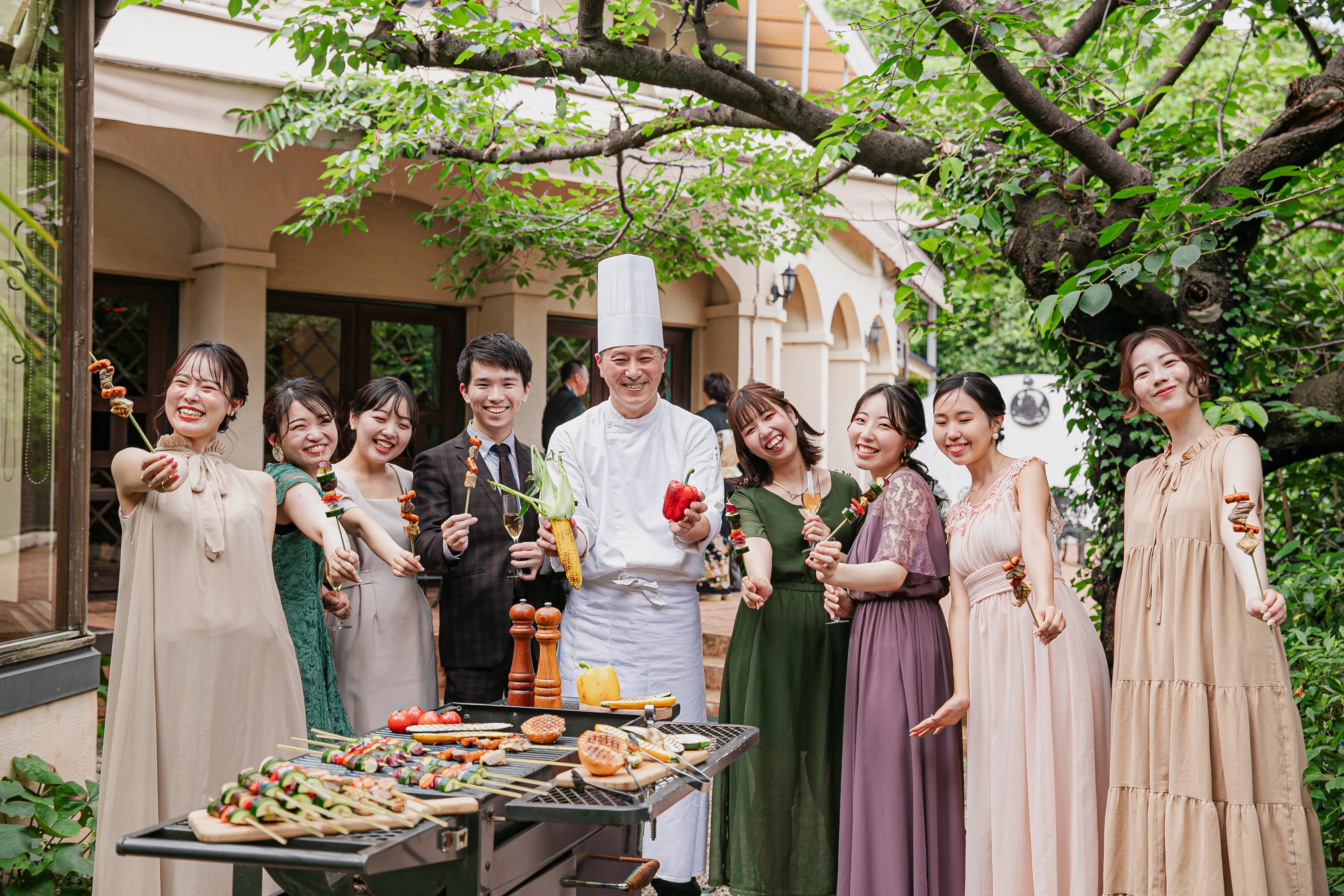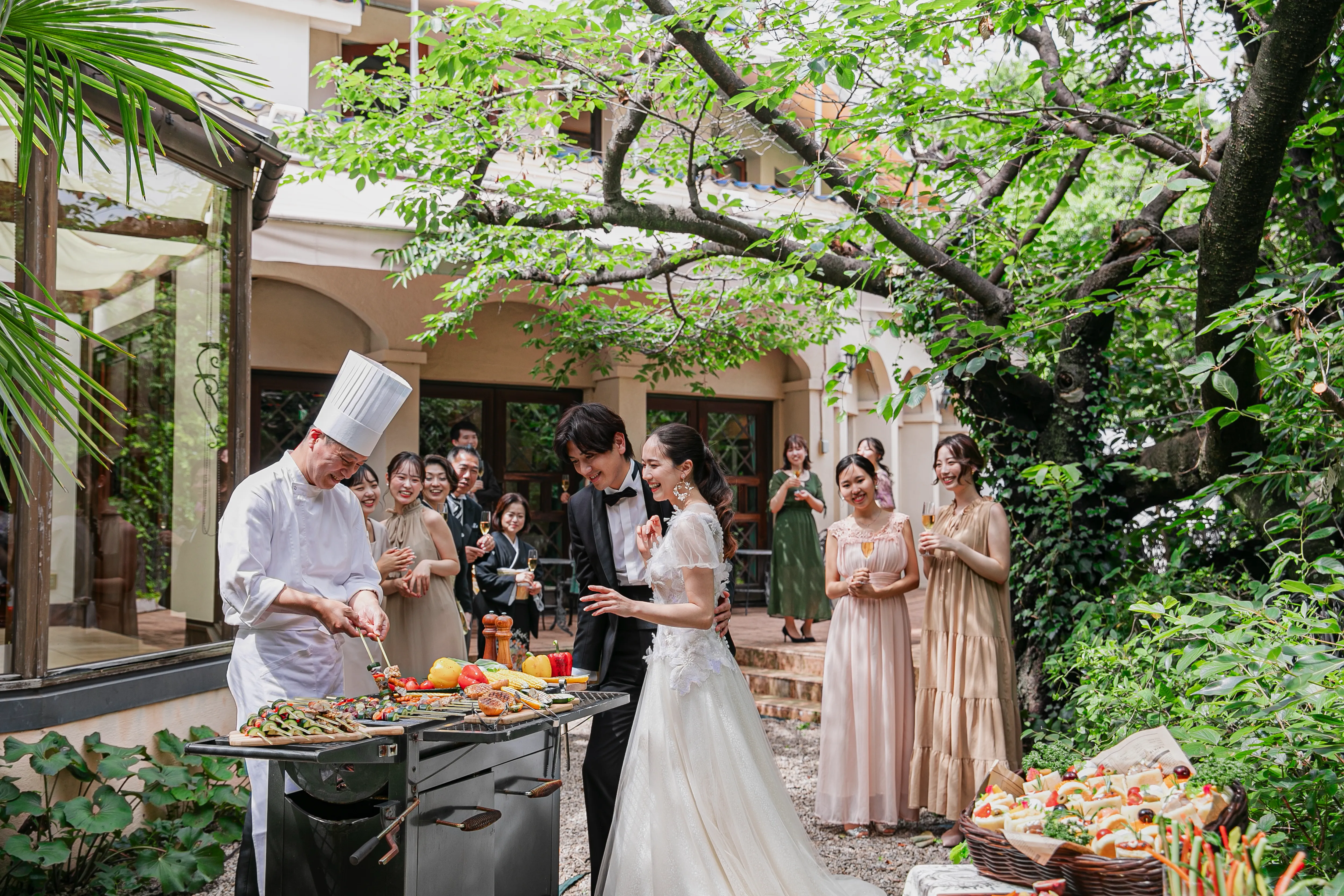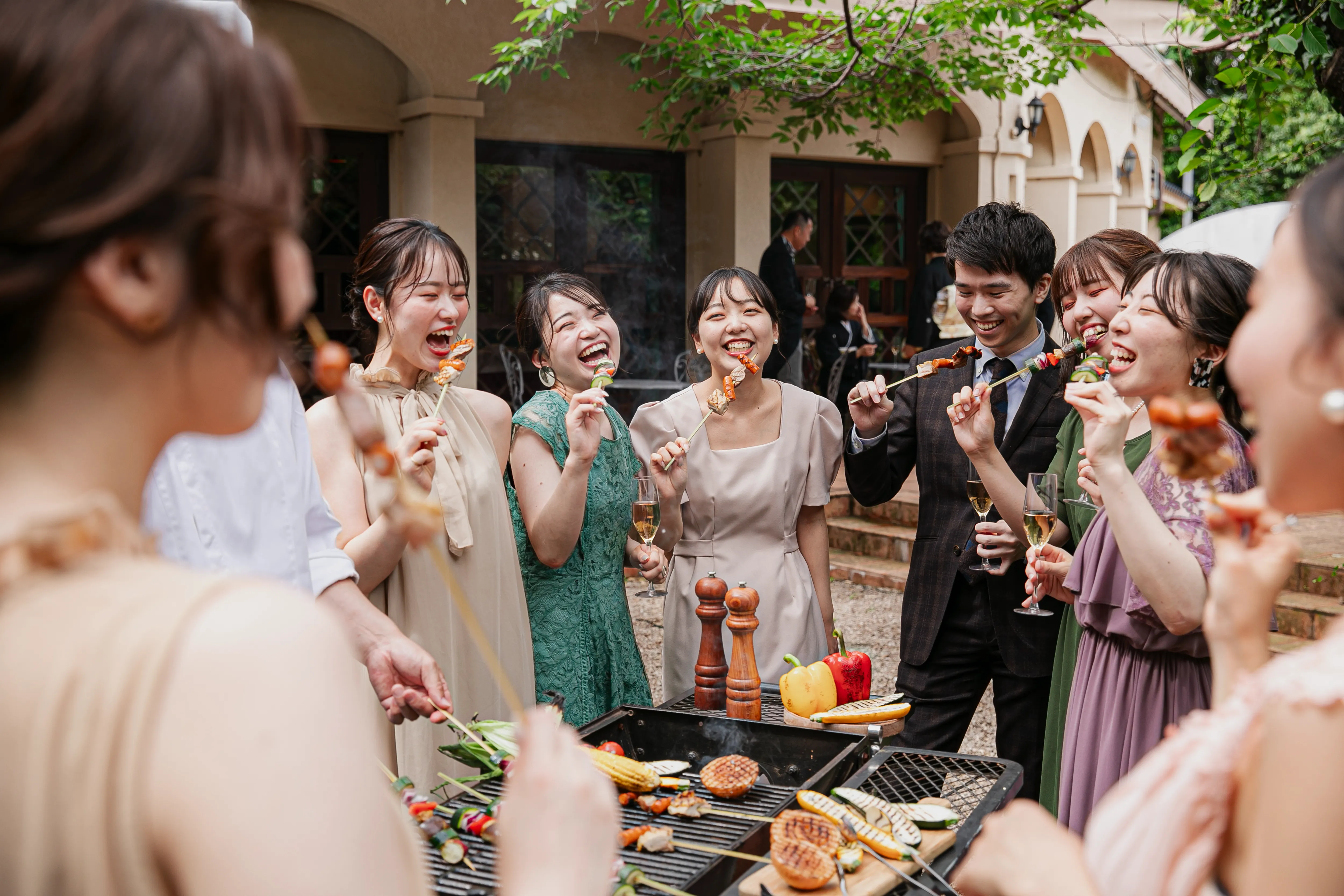 緑に囲まれながら、バーベキュースタイルでのおもてなし。ゲストの方々との和やかな時間は、貸し切りだからこそできるガーデンでのパーティです。ゲストの方々との距離が近く、まるで家に招いたかのような笑顔の溢れる楽しいシーンに。