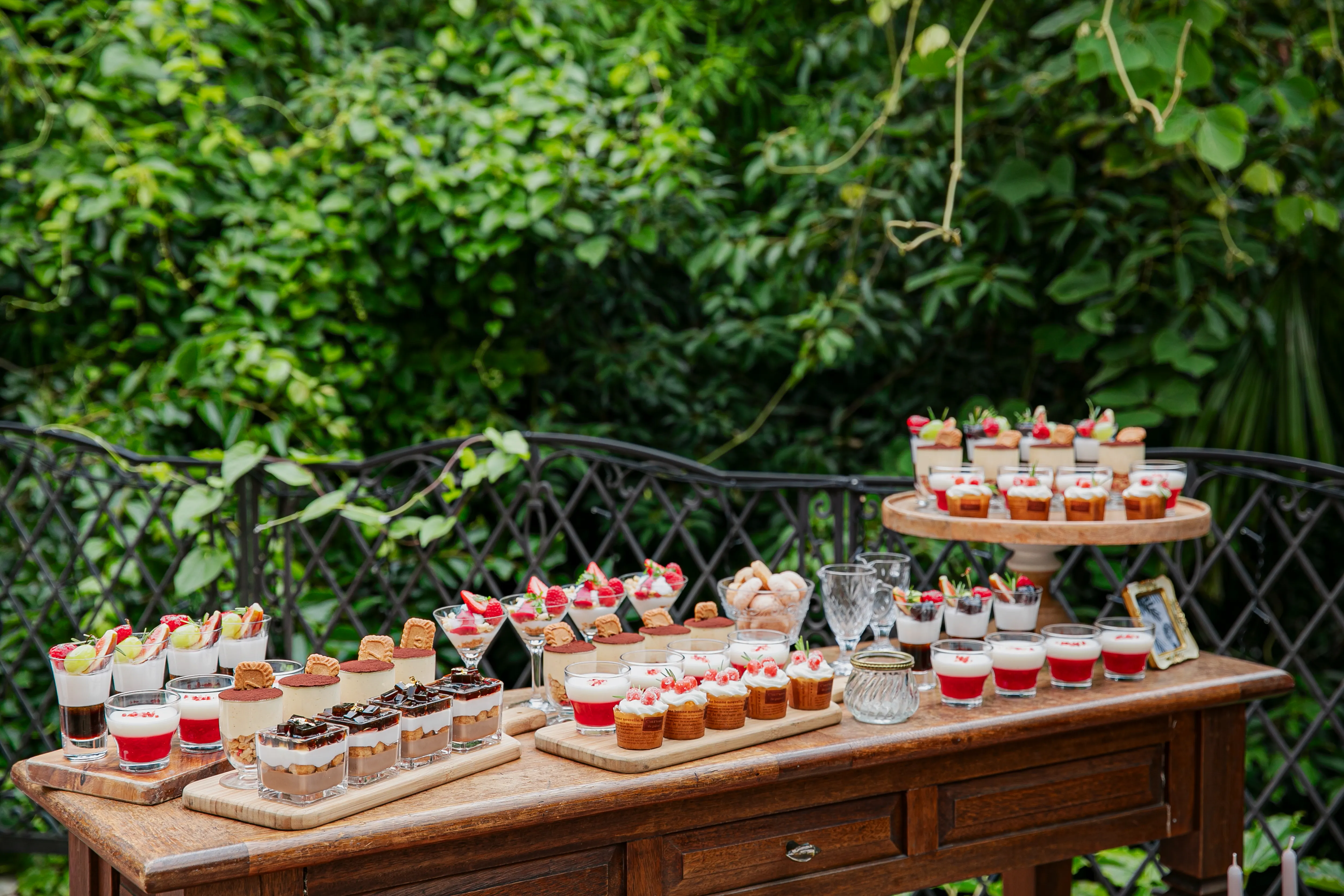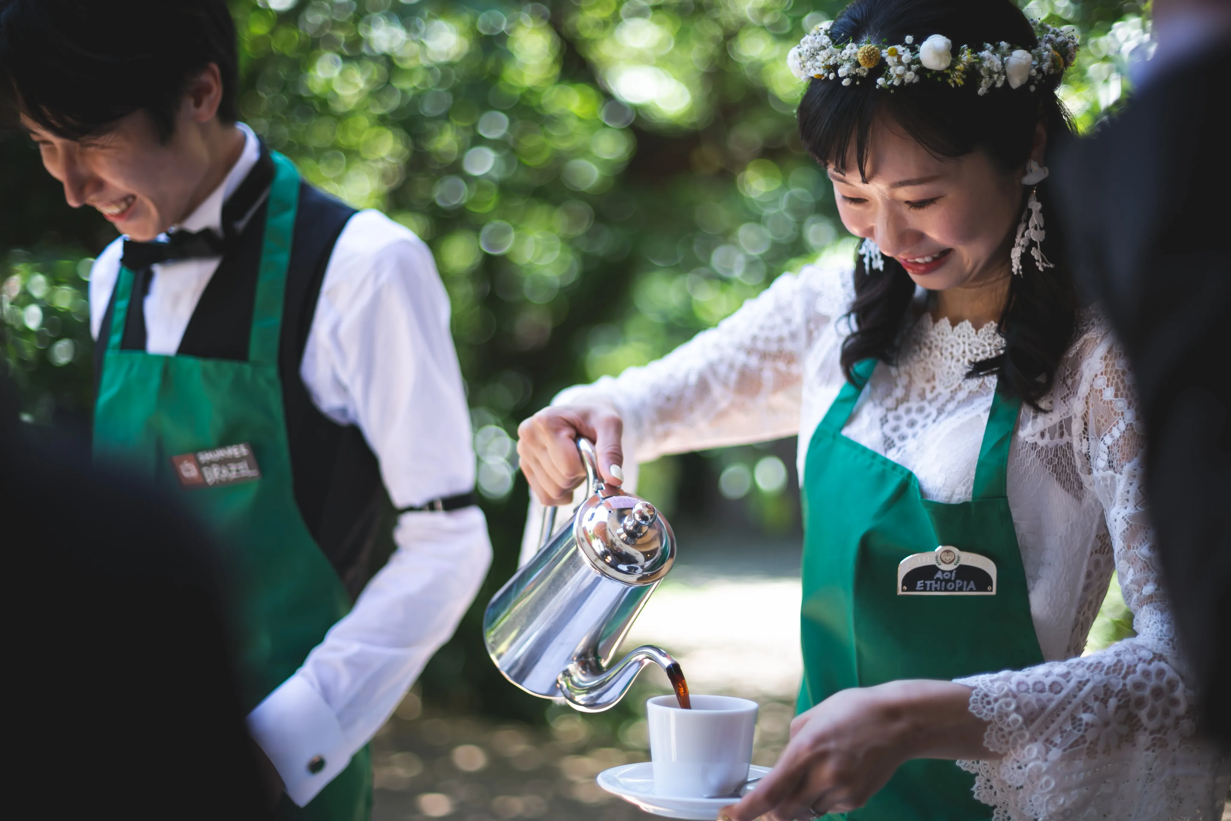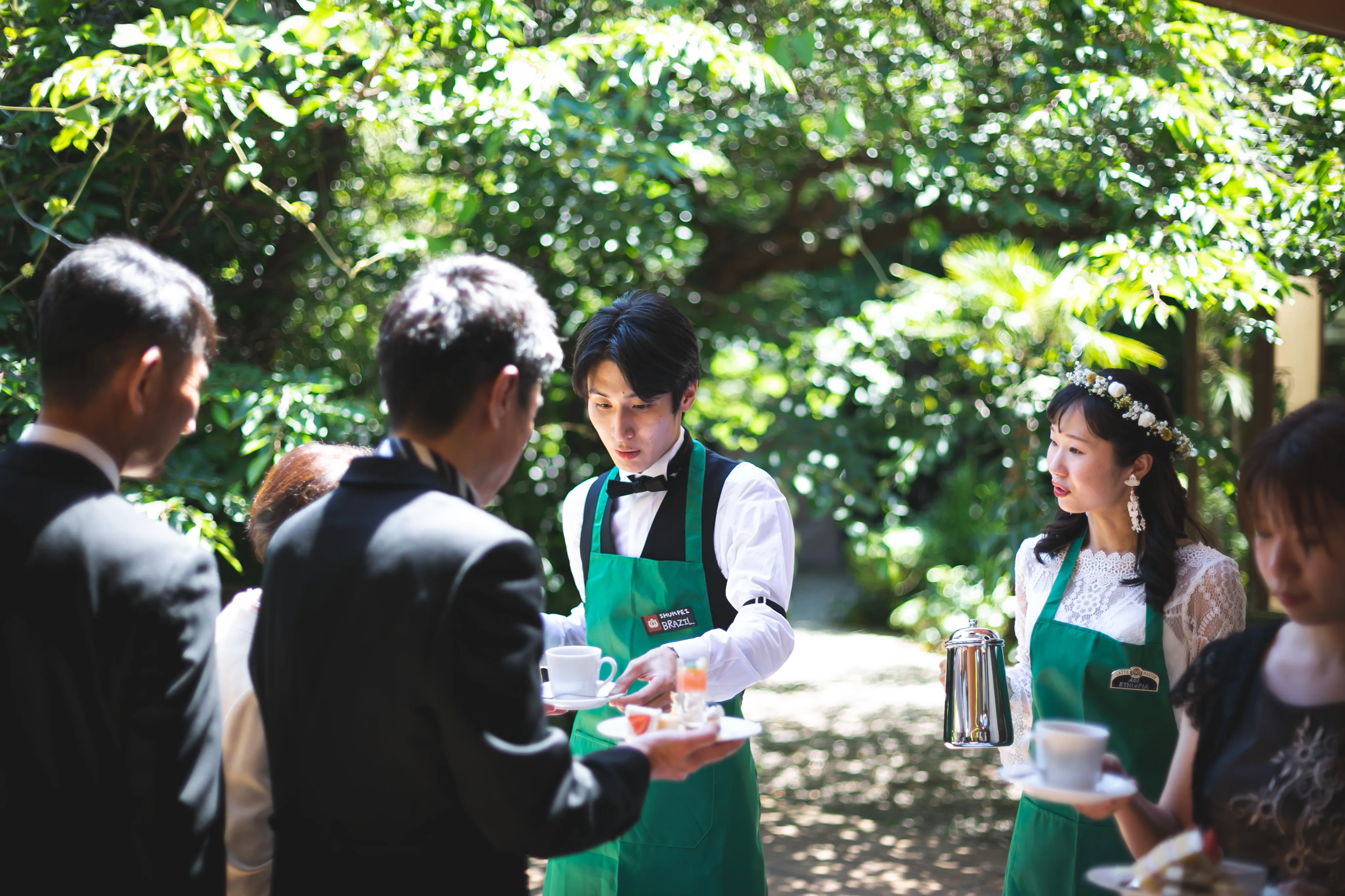 プライベートガーデンはもちろん、室内のセレモニースペースでもおもてなしすることができるデザートビュッフェ。コーヒー好きな新郎様新婦様は、自らコーヒーを注いでゲストへおもてなしも。