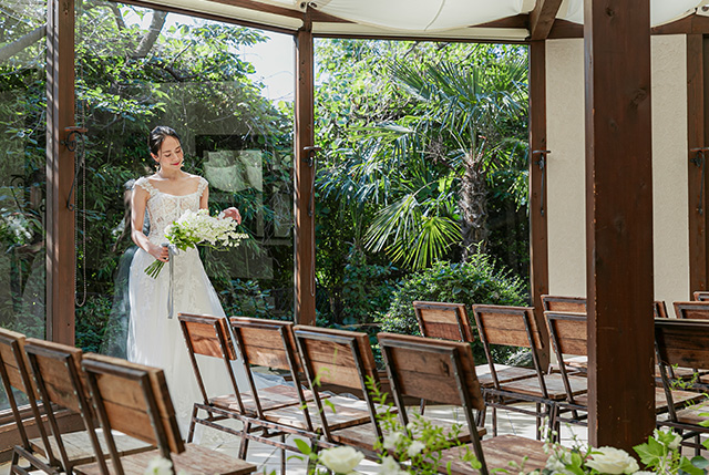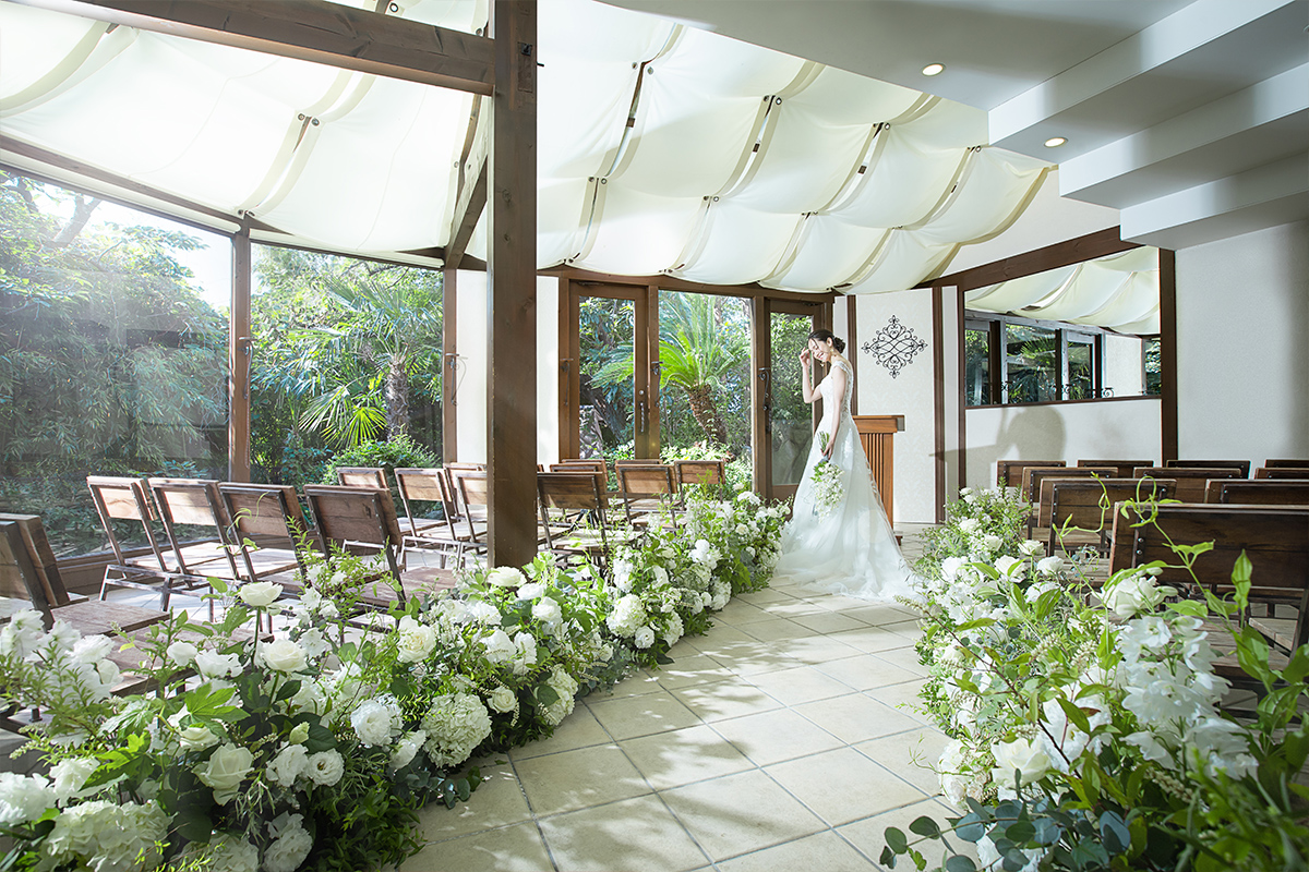 旧クルペ邸のサンルームをリノベーションしたチャペル。美しく時を重ねてきた異人館でのセレモニーは、ゲストの胸にひときわ鮮やかな印象をのこします。