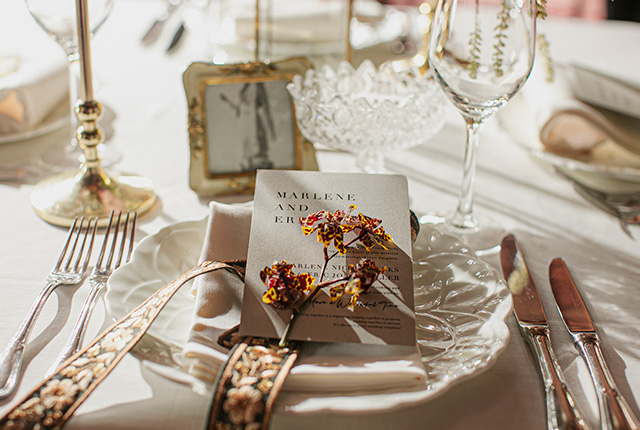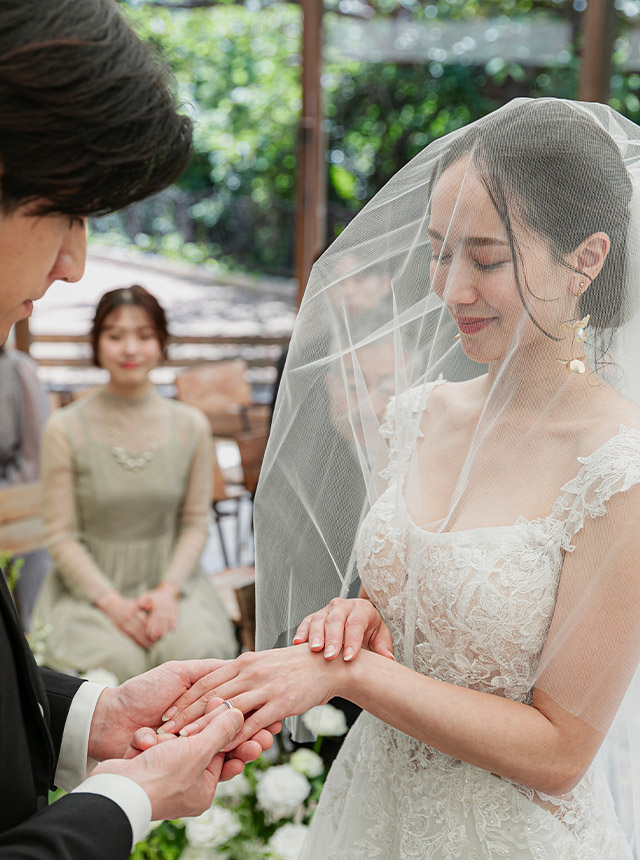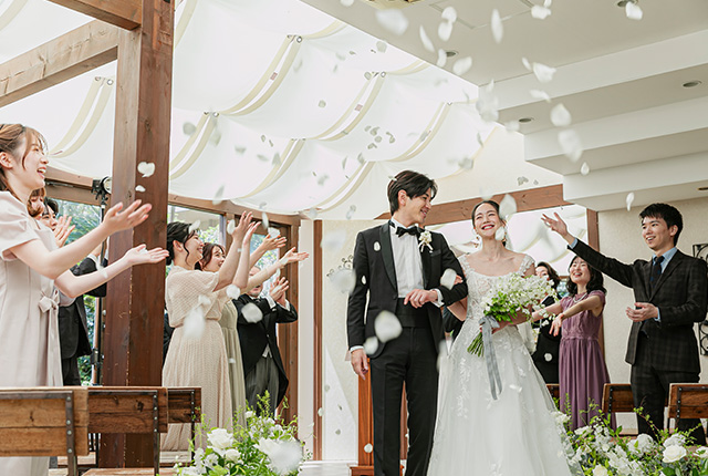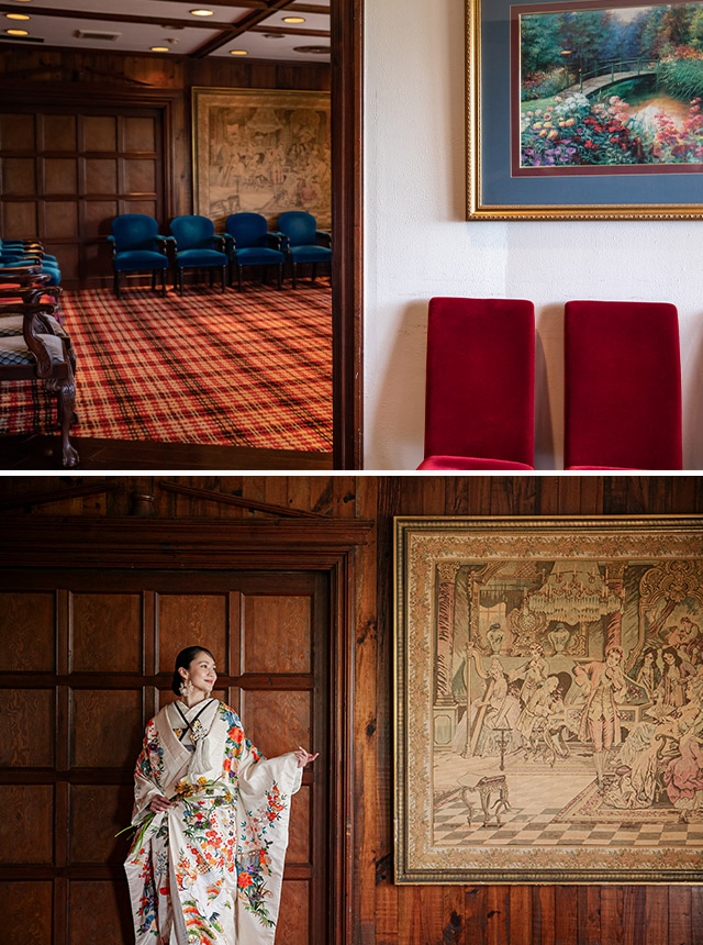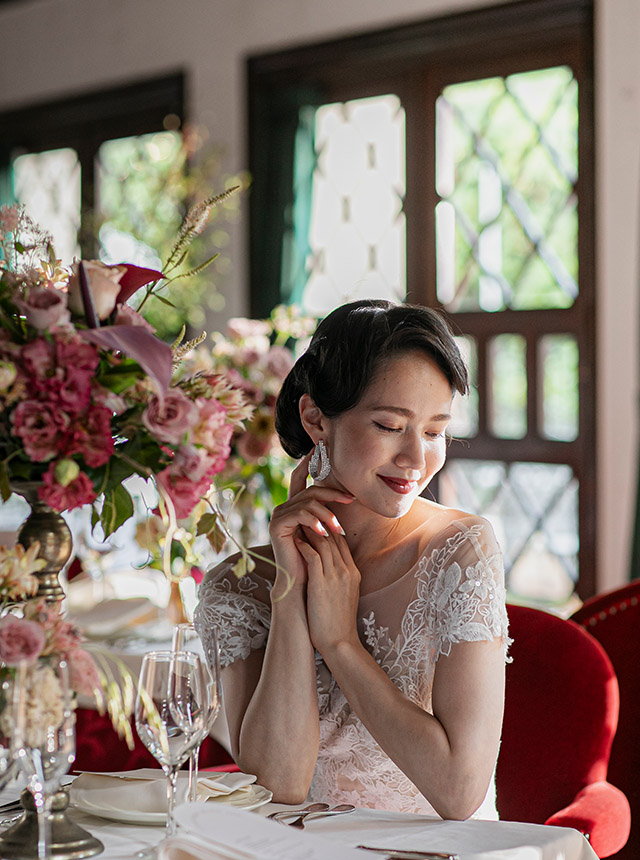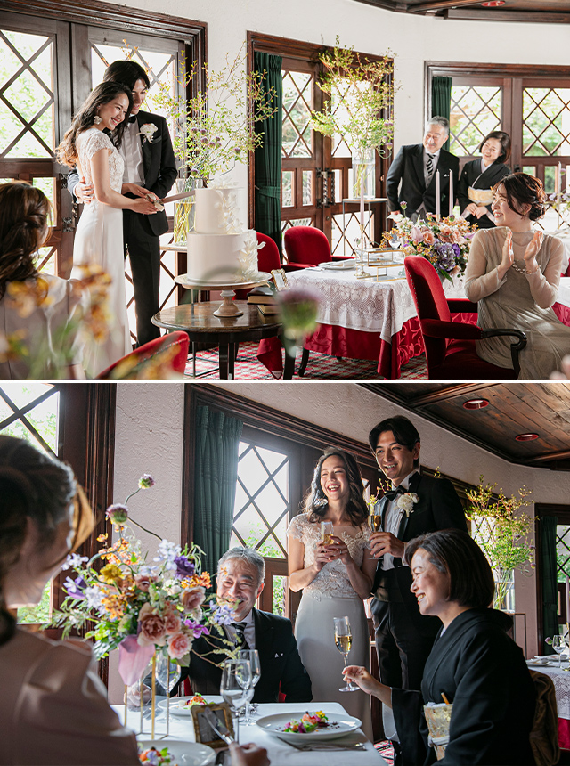 ドレスも和装も映えるモダンな設えをはじめ、フォトジェニックなポイントが豊富に揃うパーティ会場は、凛とした美しさに満ちた空間。