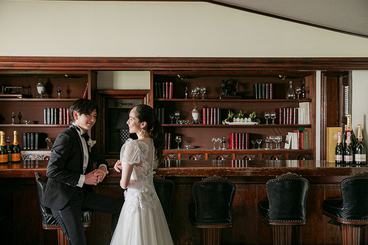 邸宅の二階に位置するモダンテイストの親族控え室はゆったりと寛げる。その横には当時を彷彿とさせるクラシックなバーカウンターが。ゲストの笑顔もはずむひととき。